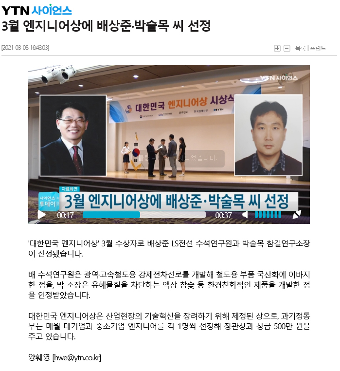 "대한민국 엔지니어상" 2021년3월 수상 선정 보도자료 (ytn사이언스 영상 보도자료) 페이지 정보 작성자 최고관리자 작성일21-03-10 13:50 조회35,591회 댓글0건 관련링크 본문 ■ ytn사이언스 영상 보도자료 ■ 댓글목록 등록된 댓글이 없습니다. 이전글 다음글 목록