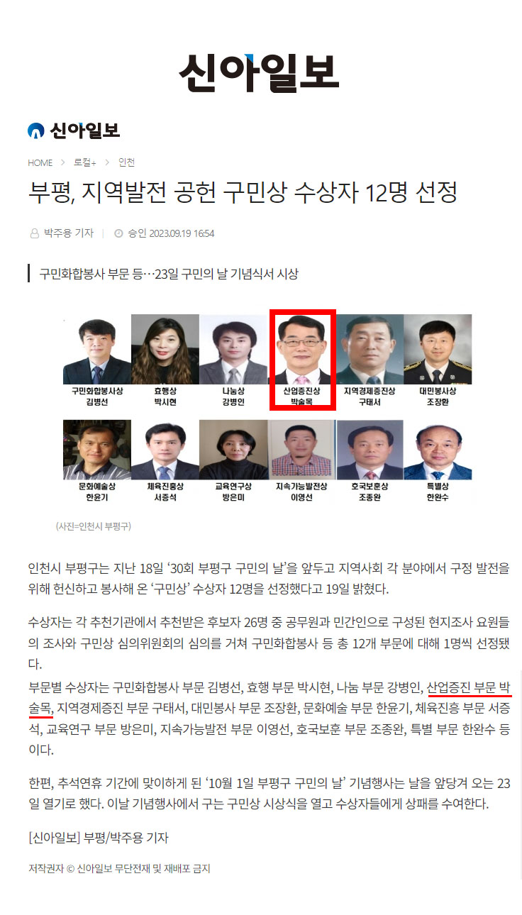 제30회 부평구민의날 기념식 박술목 대표 구민상 수상(산업증진 부문)